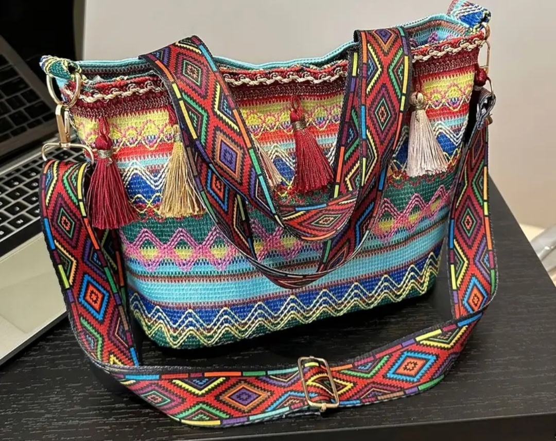This bold and colourful woven purse features tassel accents and a wide shoulder strap, perfect for adding flair to any outfit.